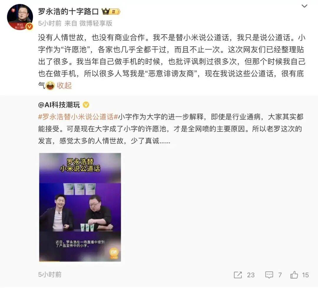 9月30日,罗永浩正在微博发文称:“我不是替小米说公道话,我只是说公道话。小字动作‘许愿池’,各家险些全都干过。”他夸大,希冀通过此次事故,全行业能够毁灭误导性的、不地道的巨细字,没有误导性的巨细字,有时依然须要的。
